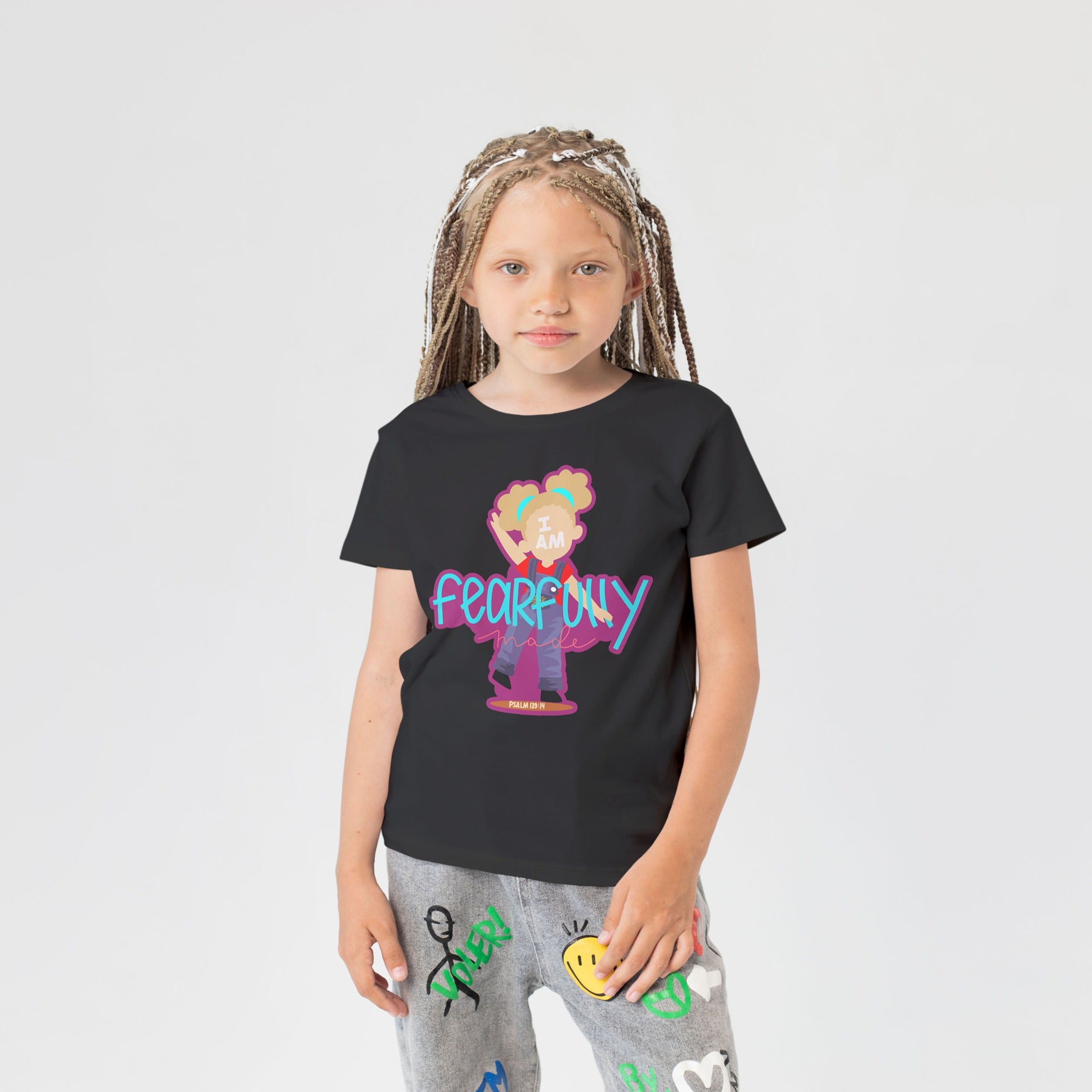 The "I Am Fearfully Made" Tee is inspired from Psalm 139:14. Crafted with care, each tee features an array of characters representative of children all over the world. Made from high-quality, breathable fabric, our tops are designed to withstand all the rigorous activities your child loves. The "I Am Fearfully Made" Tee is more than just clothing; it's a declaration of knowing how important you are to God and empowering wearers to embrace that they are fearfully and wonderfully made.